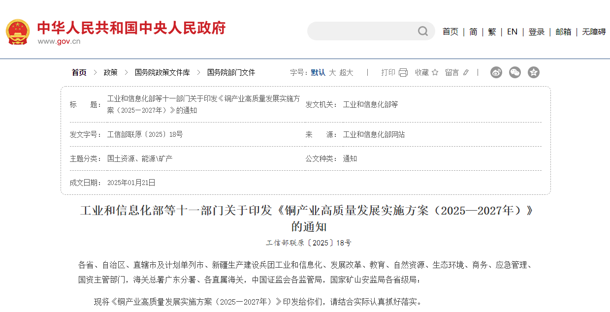 工業和信息化部等十一部門關于印發《銅產業高質量發展實施方案(2025—2027年)》的通知工信部聯原〔2025〕18號各省、自治區、直轄市及計劃單列市、新疆生產建設兵團工業和信息化、發展改革、教育、自然資源、生態環境、商務、應急管理、國資主...